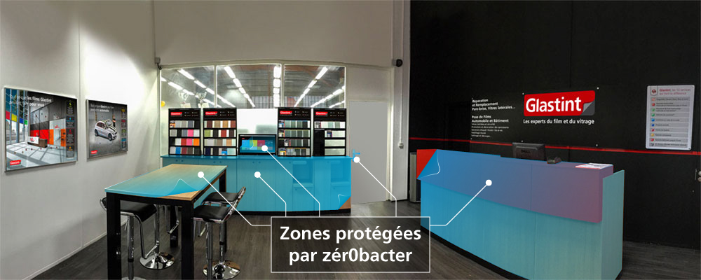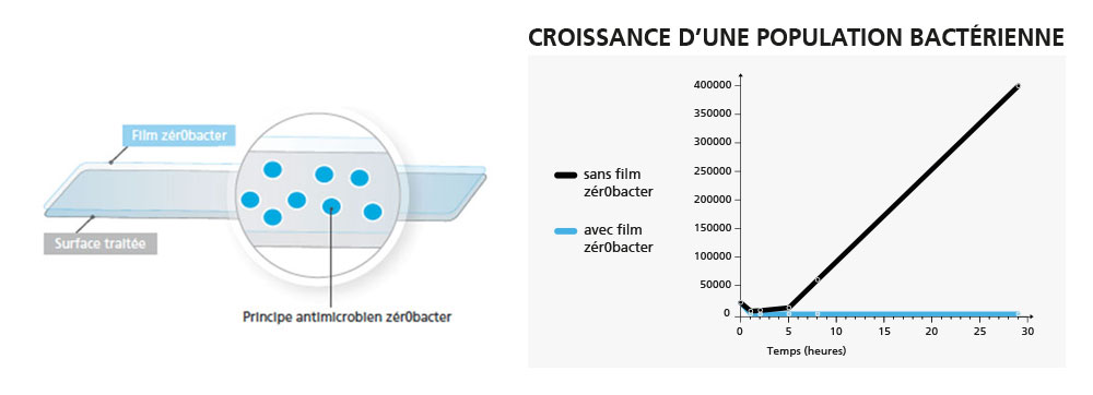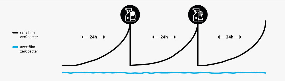 Au contact de l’humidité, les ions d’argent réactifs contenus dans le film zér0bacter sont activés depuis la couche superficielle et vont rapidement bloquer et inhiber les microbes, limitant ainsi leur prolifération entre deux protocoles de nettoyage et de désinfection.