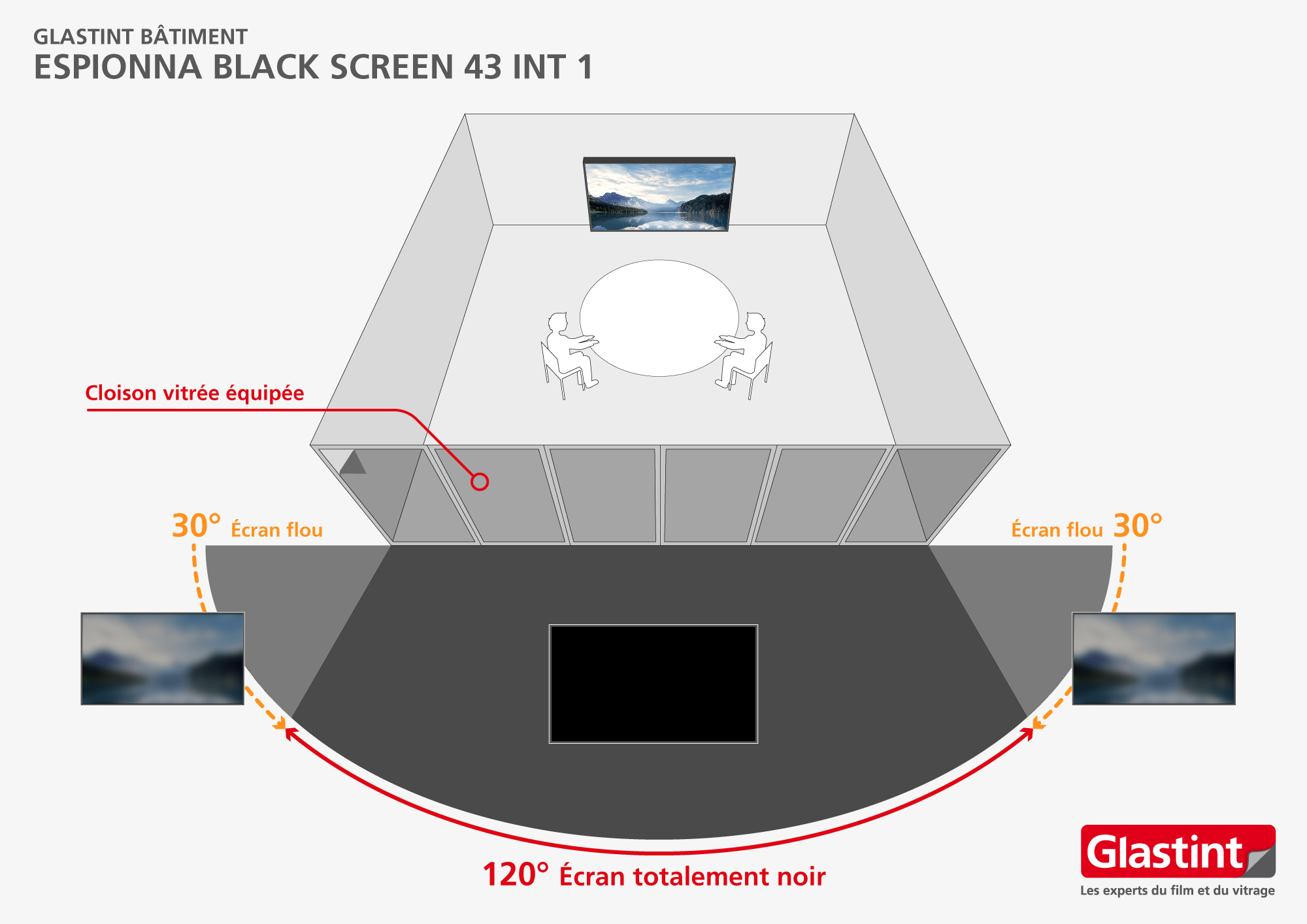 Grâce à la pose du film pour vitrage ESPIONNA BLACK SCREEN 43 INT 1, Glastint maîtrise la visibilité du contenu des écrans selon la position des personnes :