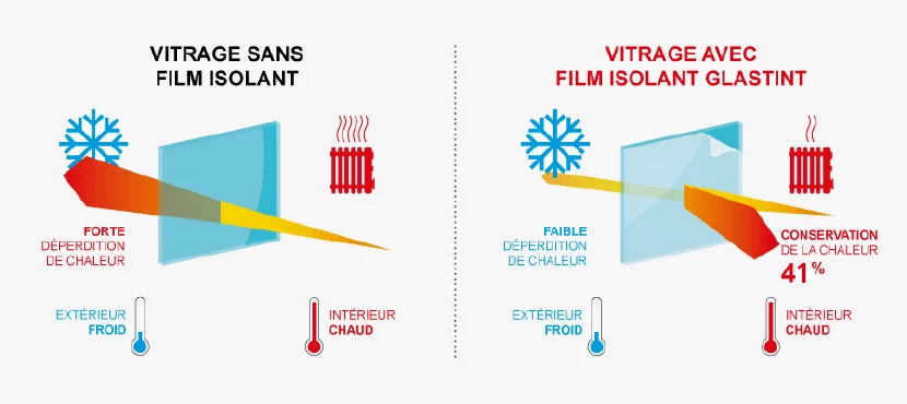 Les films pour fenêtre d’isolation au froid Glastint permettent de renforcer efficacement l’isolation des vitrages (en limitant la déperdition de la chaleur du chauffage vers l’extérieur).