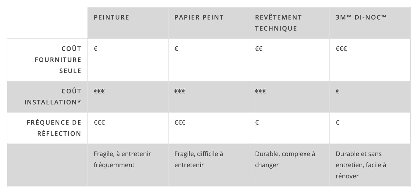 Pour répondre à ces problématiques, le géant américain 3M™, leader (entre autre !) de la fabrication de films et partenaire de GLASTINT, a développé une solution technique qui permet de décorer ou rénover un intérieur de manière qualitative, rapide et surtout sans arrêter l’exploitation du site : la gamme de film DI-NOC™.